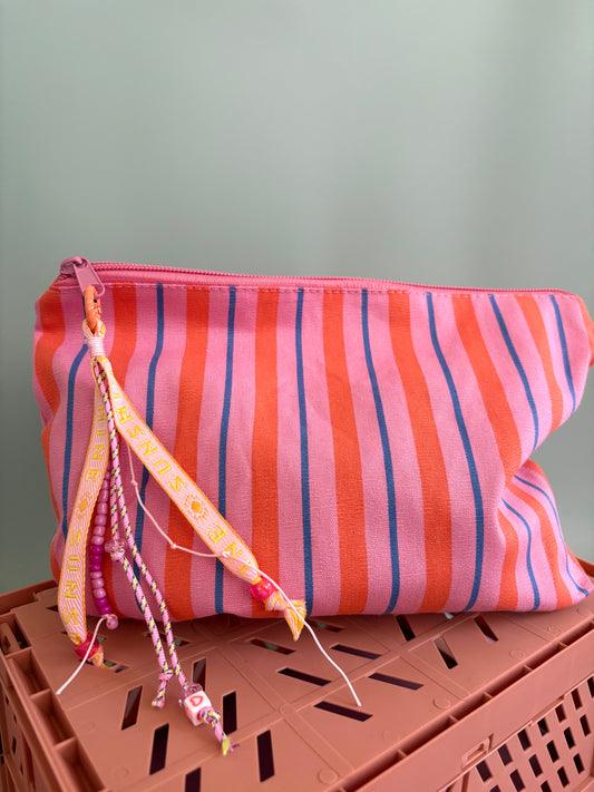 Etui/toilettasje + vrolijke sleutelhanger - Gestreept oranje/blauw