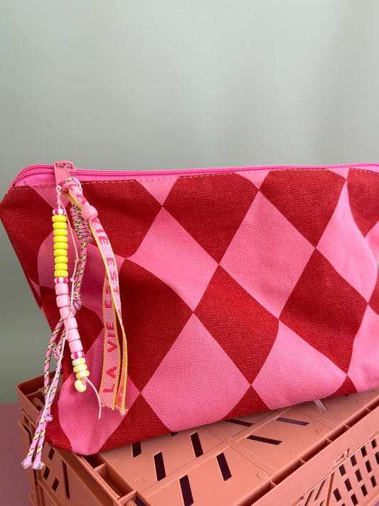 Etui/toilettasje + vrolijke sleutelhanger - Ruit roze/rood