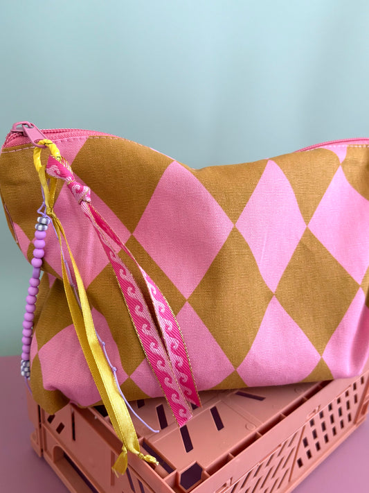 Etui/toilettasje + vrolijke sleutelhanger - Ruit licht roze/groen